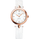 白色珍珠母贝表盘优雅动人,8枚钻石小时刻度搭配镀铑罗马数字刻度。叶形指针亦采用同种材质制成。