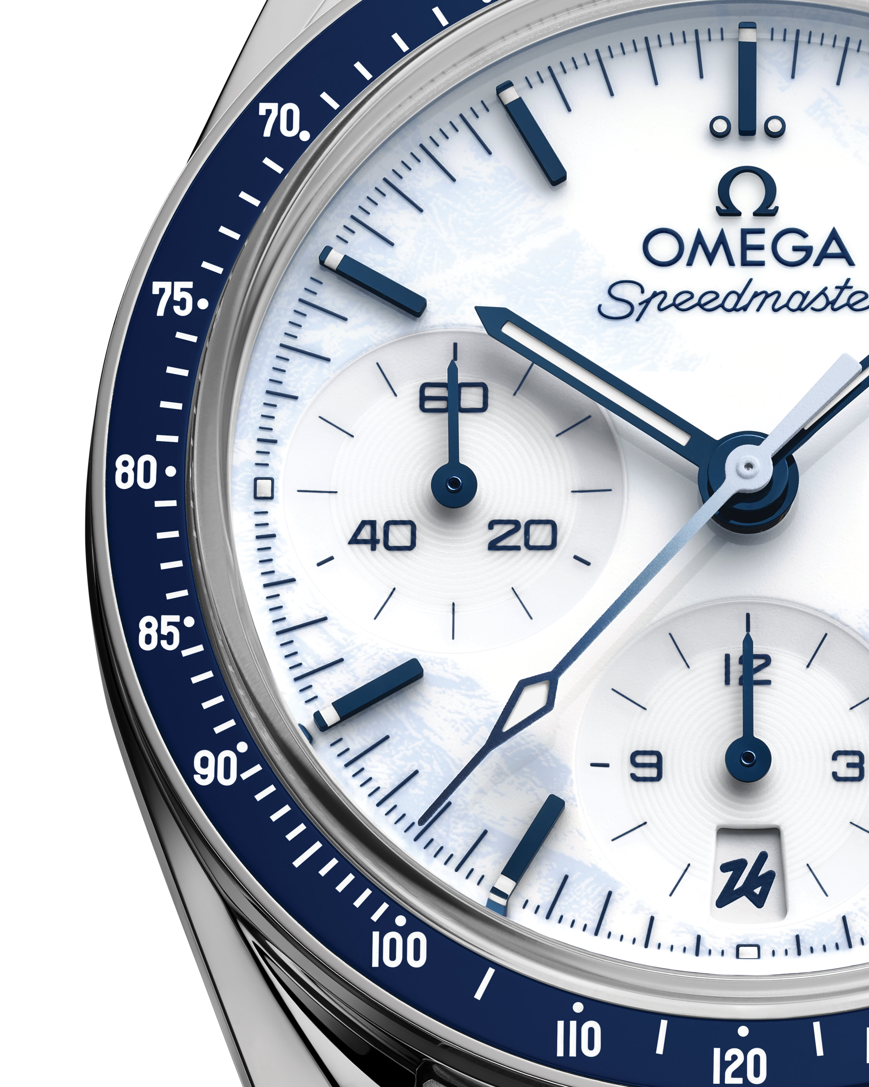 这款38毫米腕表采用精钢打造,搭配饰有白色珐琅测速刻度的蓝色陶瓷表圈。为了营造冬日氛围,腕表采用白色漆面表盘,其上饰有呈现冰霜效果的浅蓝色纹理,以及源自2026年米兰-科尔蒂纳丹佩佐冬奥会会徽的指纹痕迹图案。白色小表盘同样经由漆面处理,并饰用独特的azurage环形雕纹,仿若精心修整的滑雪坡道。