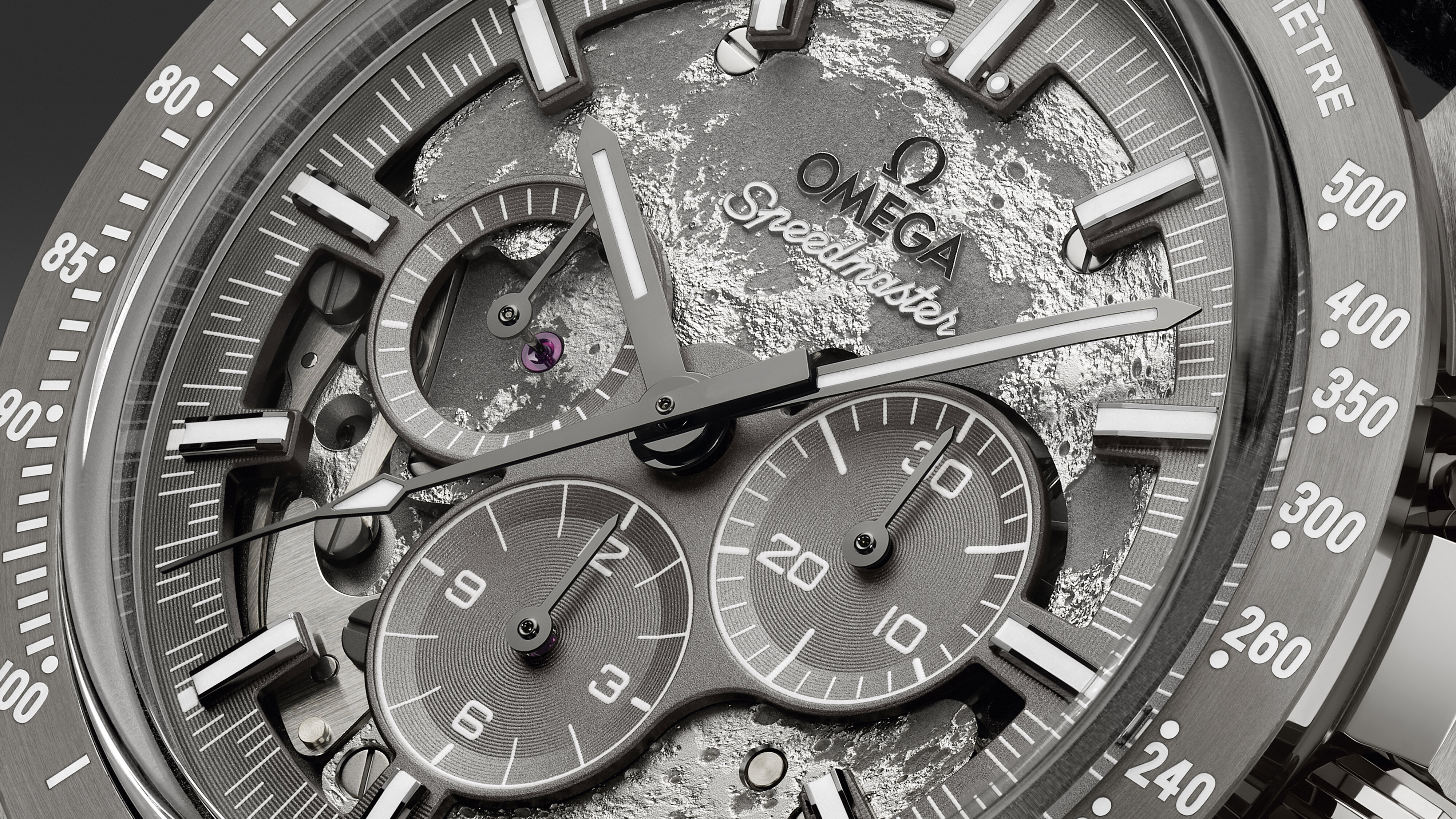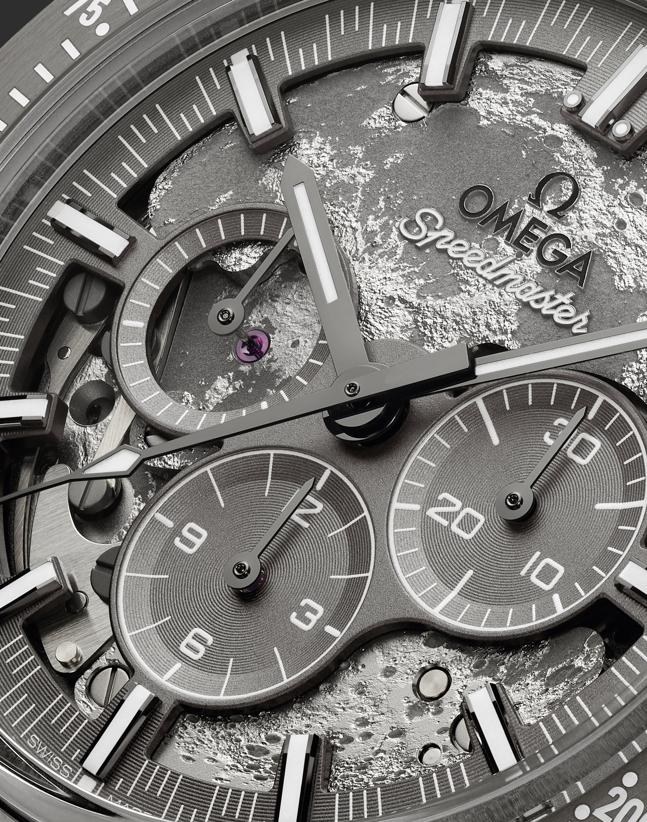 透过蓝宝石玻璃表镜,欧米茄与月球的深厚渊源呈现于眼前:机芯的摆陀和夹板经过特殊处理和修饰,采用激光烧蚀技术,生动再现月球表面的真实景象。透过灰色阳极氧化铝的镂空表盘,清晰可见人们从地球可以观测到的“月之亮面”(近地面),表背则展示了仅有宇航员看到过的“月之暗面”(远地面)。
