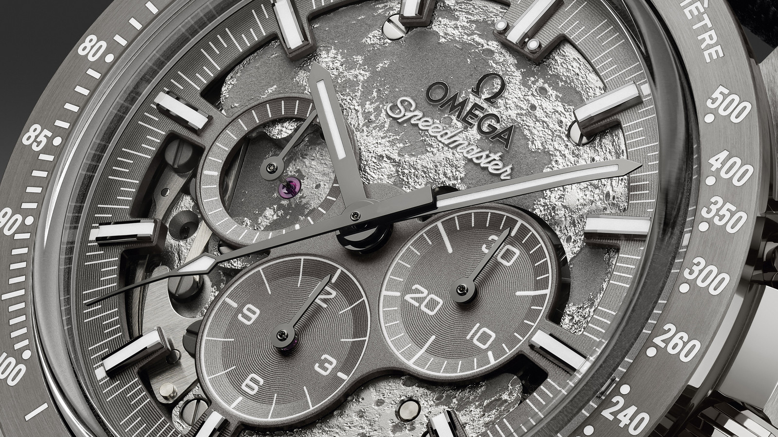 透过蓝宝石玻璃表镜,欧米茄与月球的深厚渊源呈现于眼前:机芯的摆陀和夹板经过特殊处理和修饰,采用激光烧蚀技术,生动再现月球表面的真实景象。透过灰色阳极氧化铝的镂空表盘,清晰可见人们从地球看到的“月之亮面”(近地面)地貌,表背则呈现出“月之暗面”(远地面)的景象。